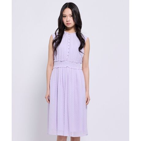 春色の爽やかな色展開で、小さなドット柄のシフォンジャカード素材のドレス。 とても涼しげで軽やか、シワにもなりにくく機能的です。上身部分はコンパクトなサイズ感で、涼しい季節は上からニットを羽織って襟をチラ見せしても上品な印象になります。