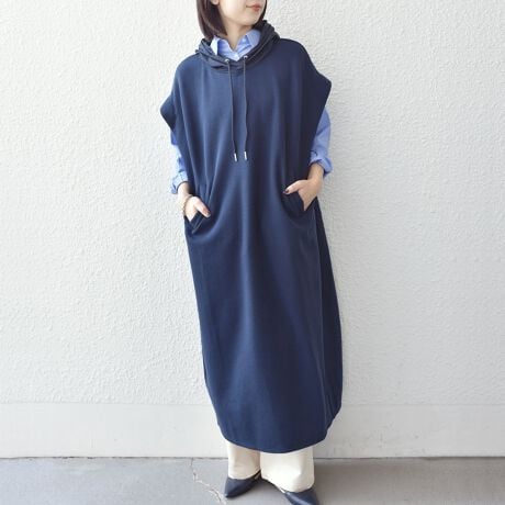 ゆったりとしたシルエットで、ストレスフリーな着心地のフードワンピース。