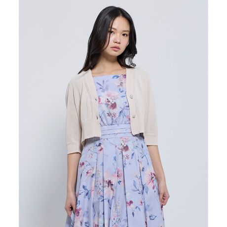 ベースはシンプルな天竺編みながら、前立て部分には編み柄の切り替えを施し、さりげない表情をプラス。フロントにはパール調ビジュー付きボタンをあしらい、上品で女性らしいアクセントに仕上げました。コンパクトな丈感とすっきりとしたVネックデザインで、ドレスやハイウエストボトムスとも好相性。きれいめスタイルからフェミニンなコーディネートまで、幅広く活躍する1枚です。