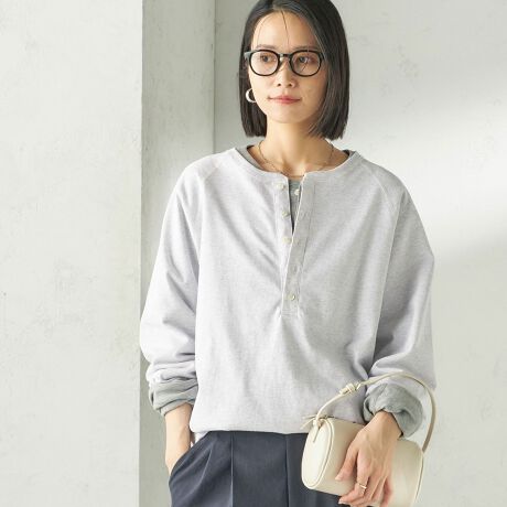 ヘンリーネック×ラグランスリーブのメンズライクなデザインに、貝釦や深めの前開きで女性らしさをプラスした、onitらしい一枚です。