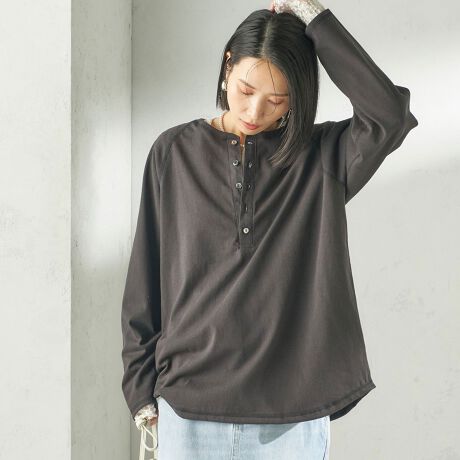 ヘンリーネック×ラグランスリーブのメンズライクなデザインに、貝釦や深めの前開きで女性らしさをプラスした、onitらしい一枚です。