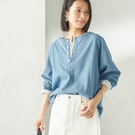 ヘンリーネック×ラグランスリーブのメンズライクなデザインに、貝釦や深めの前開きで女性らしさをプラスした、onitらしい一枚です。