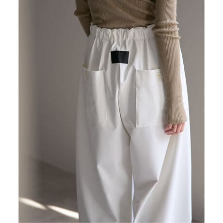 ウエストは深いタックとギャザーで程よく絞り、ドローストリングでサイズ調節が可能なボリュームパンツ。