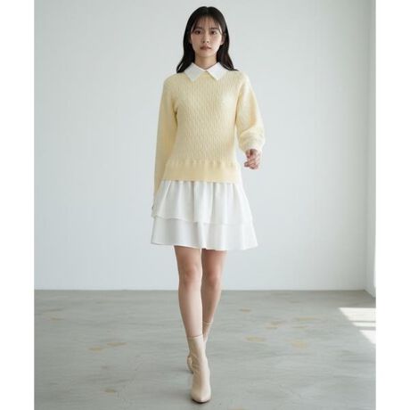 【一枚でレイヤードスタイルが完成するケーブルニットレイヤードワンピース】【Point】・ケーブル編みのニットトップスと、軽やかなティアードスカートをドッキングした一枚で着映えるワンピース。・配色のシャツ襟と袖口がアクセントになり、顔まわりをすっきり上品に演出します。・襟は取り外し可能なので、外せばクルーネックニットワンピースとしても着用できる2wayタイプです。・ティアードデザインになったスカート部分は歩くたびにふんわり揺れる軽やかなシルエット。・ウエスト部分は締め付け感がなく、リラクシーな着心地も魅力です。・袖口にもシャツ素材をレイヤードしたようなデザインを施し、細部まで抜かりない一枚に。ケア方法:手洗い可能透け感:なし裏地:なし伸縮性:ニット部分のみあり光沢感:なし生地の厚さ:中肉