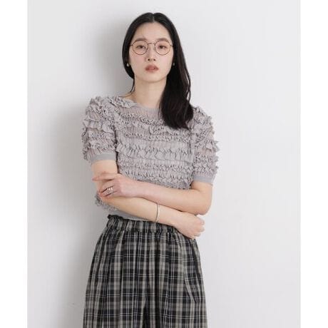 繊細さとクラフト感を併せ持った、存在感のある半袖ニットトップス。レースのような透かし柄で編み立てた土台の上に、共糸の総針テープをシャーリング糸でたたき、フリル状に何列も配置した拘りのデザインです。