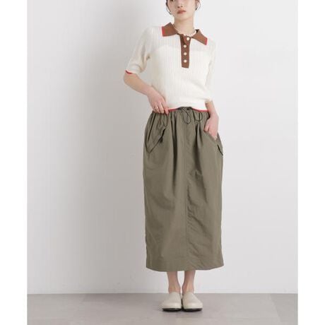 軽量でハリのあるナイロン素材を使用したギャザースカート。ウエスト部分はドロスト仕様で、デザインのアクセントにもなるスポーティーなディティールが特徴。ポロニットと合わせたトレンドライクなスタイリングから、きれいめなトップスと上品さをミックスした着こなしまで幅広く楽しめる一着です。