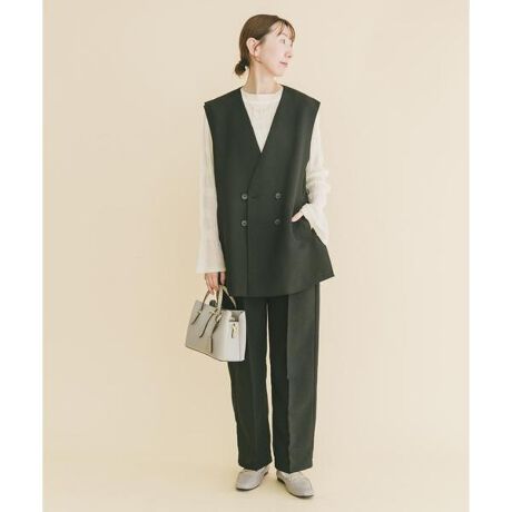 ホップサック素材を使用したジレ×パンツのセットアップは、時短でおしゃれが完成する頼れる一着。トレンド感のあるダブルボタンデザインのジレが、さっと羽織るだけで着こなしにクラス感をプラスします。インナー次第でロングシーズン着用でき、ジレ・パンツともに単体使いも可能。シルエットがきれいで、デイリーはもちろんお仕事シーンやちょっとした式など、きちんと感が欲しい場面にも対応できる万能セットです。
