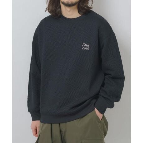光の当たり方で陰影が浮かぶ、斜めストライプのジャカード編みが印象的なロングスリーブカットソー。生地自体に立体感があるため、シンプルながら一枚で着ても様になる仕上がりです。左胸には筆記体ロゴの刺繍をあしらい、さりげない上品さをプラス。程よくゆとりを持たせたシルエットで、リラックス感がありながらもだらしなく見えず、今の季節は主役として、秋冬にはインナーとしても長く活躍します。