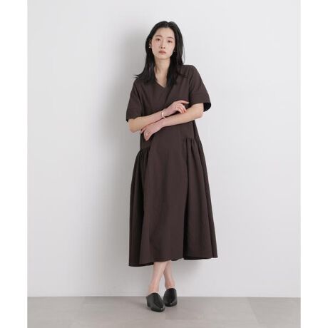 一枚でサマになるサッカー素材のワンピース。すっきりとしたVネックに、ローウエスト位置からギャザーが広がるシルエットが大人っぽさのある一着。ポコポコとした立体感が特徴のさらっとしたサッカー素材で、軽くて涼しい着心地も魅力です。