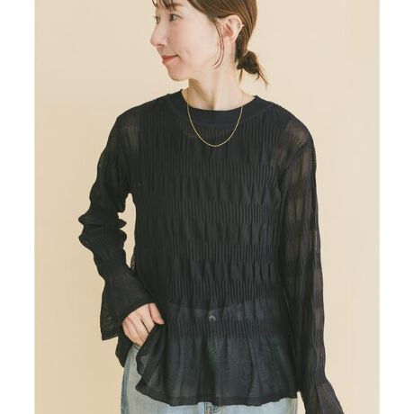 生地全体にシャーリングを施し、立体感のある表情に仕上げたニットトップス。無地ながら奥行きのあるテクスチャーが、シンプルなスタイリングにも自然な華やかさをプラスします。袖口に向かって広がるフレアスリーブは、動くたびに軽やかに揺れ、手元を女性らしく演出。ほんのり透け感のある素材で、インナーとのレイヤードも楽しめます。どんなテイストのボトムとも合わせやすく、デイリーにもお出かけにも活躍する一枚です。