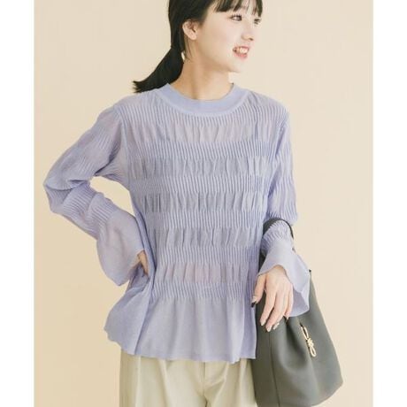 生地全体にシャーリングを施し、立体感のある表情に仕上げたニットトップス。無地ながら奥行きのあるテクスチャーが、シンプルなスタイリングにも自然な華やかさをプラスします。袖口に向かって広がるフレアスリーブは、動くたびに軽やかに揺れ、手元を女性らしく演出。ほんのり透け感のある素材で、インナーとのレイヤードも楽しめます。どんなテイストのボトムとも合わせやすく、デイリーにもお出かけにも活躍する一枚です。