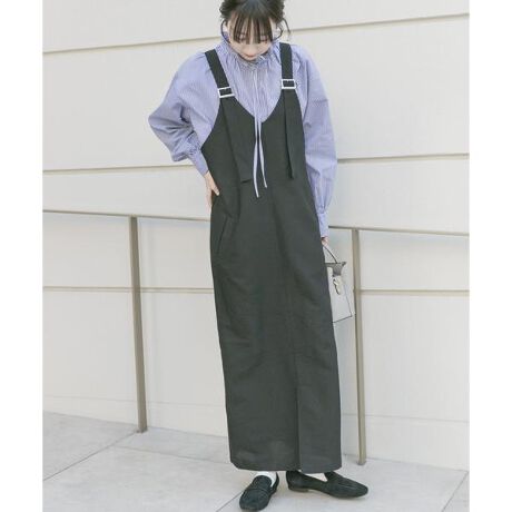 粗めの織り目が特徴のホップサック生地を使用した、大人のためのジャンスカ。立体感のある表情とさらりとした風合いが、シンプルな装いにも奥行きを与えてくれます。シワになりにくく、季節を問わずきれいめに着こなせるのも嬉しいポイントです。首元をすっきりと見せる深めのVネックに、広がりすぎないストレート寄りのシルエット。肩紐のバックルデザインがさりげないアクセントとなり、全体を引き締めた印象に仕上げます。インナー次第で表情が変わり、オン・オフ問わず活躍。着回し力の高さも魅力の一着です。