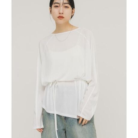 さらっと肌触りの良い素材を使用したシアーカットソーと、ストラップがセットになったアイテム。ルーズなシルエットなので抜け感が叶えられ、付属のストラップはウエストに巻いたり、チョーカーのようにしたり楽しめます。様々なボトムと合わせやすいです。