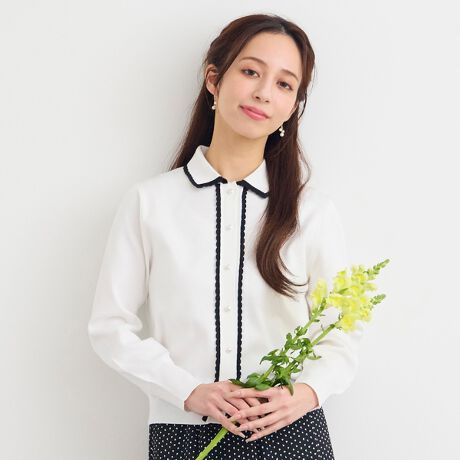 モノトーンでシンプルな色使い。配色のアクセントが効いています。フェミニンな着こなしに似合うかわいらしいニットカーディガン。