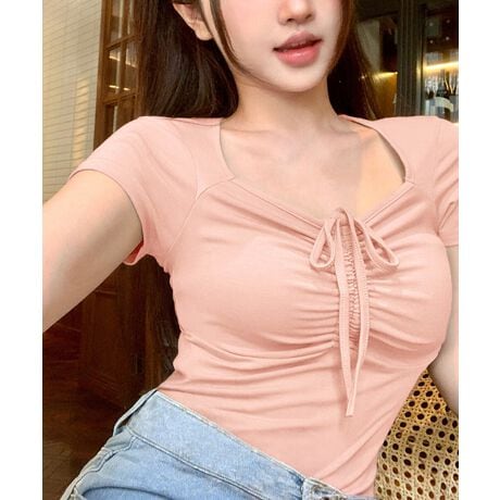 スクエアネック×ドローストリングのレディース半袖Tシャツ。