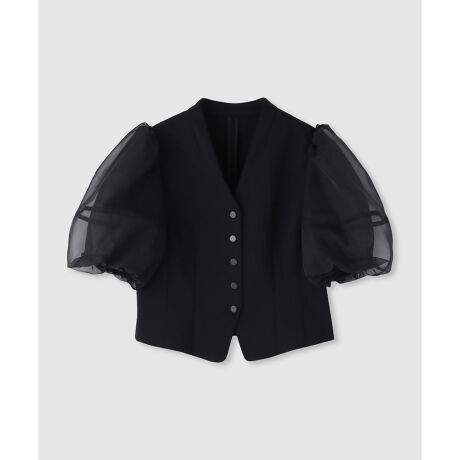 ジャージ素材のジレに、シアーなオーガンジーのボリュームスリーブをドッキングしたデザイントップス。