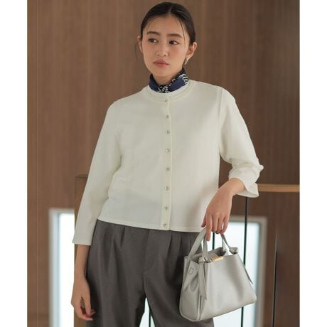 ■デザイン・背中の気になる部分を自然にカバーし、首や肩が美しく見える絶妙なサイズ感と、少し多めにつけたビジュー釦は、シンプルなデザインのチャームポイント。・デザインと着心地の良さを兼ね備えました。・コンパクトなシルエットでどんなボトムとも合わせやすく、釦を全部留めてTシャツライクにプルオーバーとして着るのもおススメです。・手首が美しく見える絶妙な袖丈にこだわりました。・ダルっとしない素材感が好バランスをつくり、コーディネート次第で様々な表情をみせてくれます。