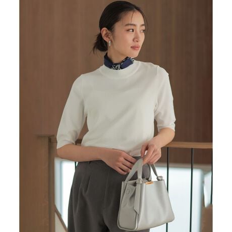 ■素材・伸縮性のある糸に極細のストレッチ糸を加えることで、もっちりとした着心地と体のラインをひろいすぎない適度な肉感、きゅっとつまった編地の表情がポイントの素材です。・強撚糸のもつ光沢感がさらに上品な印象にしています。・コーディネートの鮮度を上げてくれるカラーの発色の良さも魅力です。