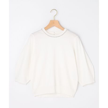 華やかなパーツを施した襟元が女性らしいシンプルベーシックな6分袖ニット