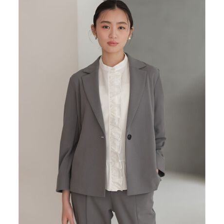 ■デザイン・裏無しのジャージ素材のシンプルな1つボタンのテーラードショートジャケットは着心地が良くシワを気にせず着用できます。・後ろがぺプラム切り替えでフレアを出したバックシャンがさりげないポイント。・シンプルなのでボトムもインナーも選びません。・スッキリとしたパネルラインからのスリットポケット仕様。