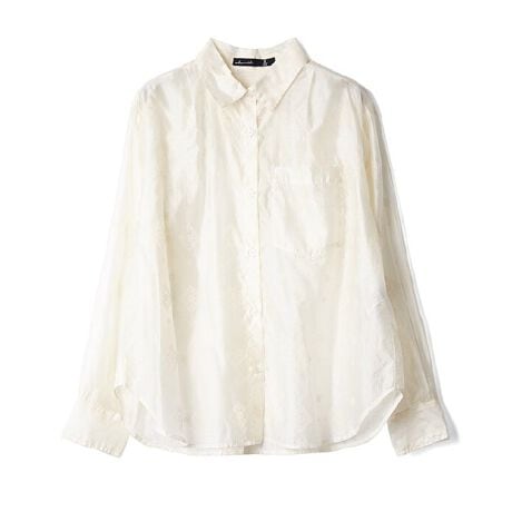 シアー素材に、刺繍のような少しぷっくりとしたプリントを施した上品なシャツ。