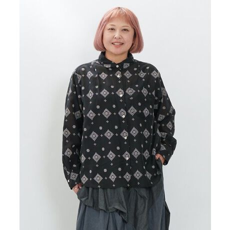 シアー素材に、刺繍のような少しぷっくりとしたプリントを施した上品なシャツ。