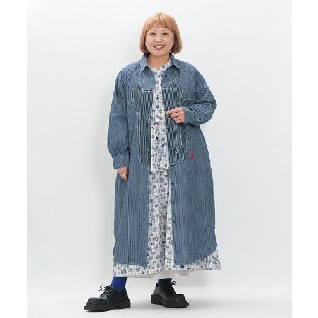 よく見ると前身頃に大きなネコが隠れている、遊び心たっぷりのヒッコリー生地ワンピースです。