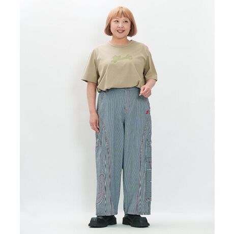 新鮮な切り替えラインが目を引く、ヒッコリーデニムパンツ。