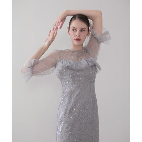 襟元からバストラインにかけて贅沢に配されたチュールのギャザーフリルが、デコルテを華やかに彩りつつ、シアーな透け感で大人の抜け感をプラス。