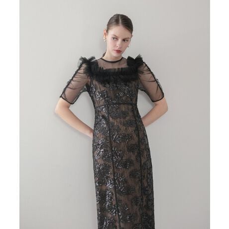 備考:チュールギャザーフリル / フラワーモチーフスパンコール刺繍(レース地) / Iラインシルエット / 裏地あり