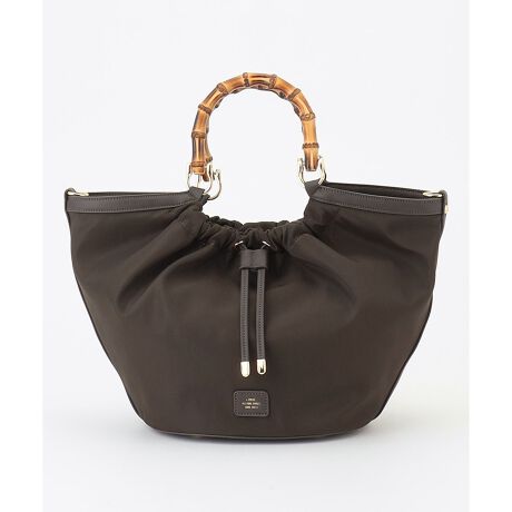春夏らしいデザインのバンブーハンドルのトートバッグ。フロントにギャザーとドロストをあしらったデザインで、本体は撥水ポリエステルを使用し軽量化しています。(ドロストはデザインなので動かさずにバッグの開閉が出来ます。)付属のロングショルダーを取り付け、斜め掛けとしても使用でき、ペットボトルや日傘なども収納して頂けるちょうど良いサイズ感になっています。高級感のあるバンブーハンドルと春夏らしいギャザーデザインで、持つだけでコーディネートの鮮度が上がるアイテムです。カラーは、明るすぎないスモーキーカラーのベージュ(#033)、合わせやすいトラディショナルなカラーのネイビー(#075)、初夏のスタイルにぴったりのブラウン(#030)の3色展開です。