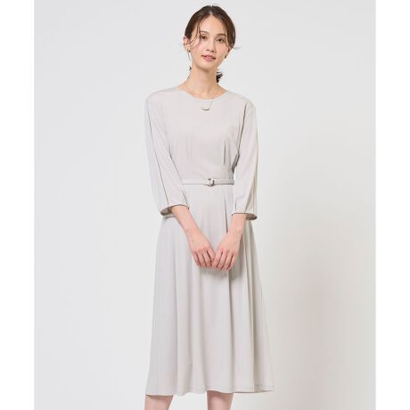 ジャージ素材ならではの快適な着心地と、ウエストのタックが生む立体的なシルエットが魅力のワンピース。伸縮性に優れた素材が体の動きに優しくフィットし、長時間の着用も快適な1着です。ウエスト部分にはタックを施すことで、立体感のあるフォルムときちんと感を演出します。付属の共地ベルトには華奢な薄金カラーのバックルをあしらい、さりげない輝きが上品なアクセントに。ペチコート付きで透け感を気にせず安心して着られるのも嬉しいポイントです。ジャケットを羽織ってオフィススタイルに、1枚で華やかに食事会など、春の行事やきれいめなシーンで幅広く活躍します。カラーは、やわらかい色味で顔周りが明るくなるライトグレー(#003)、落ち着きのあるニュアンスカラーのグレー(#004)、シーンレスで使えるネイビー(#075)の3色展開です。