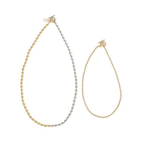 [型番:319200591]シルバーとゴールドのボールチェーンを使用した2連のネックレスです。長い方はだ円形のボールチェーン、マンテル部分に淡水パールをつけたこだわりのあるネックレスです。また2つのマンテルをを繋げて1連としてもお使いいただけます。■お問い合わせ品番:319-20-0591※末永く愛用頂く為に、アテンションタグを必ずご確認の上、着用又はお取り扱いください。