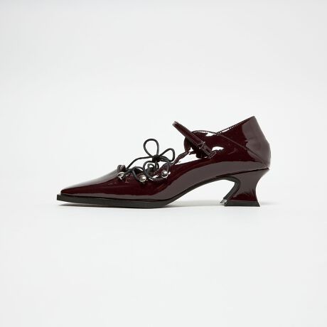 スカラップのカットラインやレースアップが印象的なパンプス。