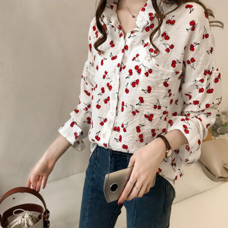 -総柄でも派手すぎないチェリー柄。1枚でコーデが完成する主役ブラウス。