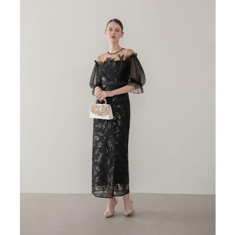 備考:リーフモチーフスパンコール刺繍 / チュールパフスリーブ / ウエストマークデザイン / Iラインシルエット