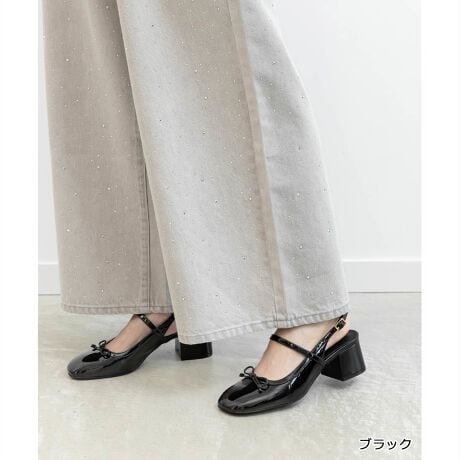 艶やかなエナメル素材がエレガントな印象のバックストラップパンプス。