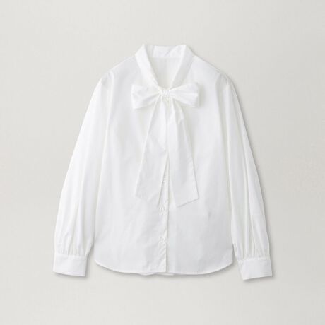 トレンド感のある大きめのボウタイが、華やかさと上品さを両立させるブラウス。後ろ身頃はヨーク切り替えとタックが入っており、春はジャケットやジレのインナーとして、暑い時期には1枚で着てもスタイリングが決まる、着やすいサイズ感のベーシックシャツアイテムです。