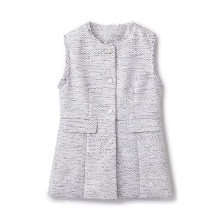 スカートにもパンツにも合わせやすい68cm丈のツイードジレ。ハイウエスト位置の切り替えと、飾りフラップがアクセントになり、さらっと羽織ってもスタイルアップして見えます。襟ぐりと袖ぐりのフリンジ仕様もポイントになっています。