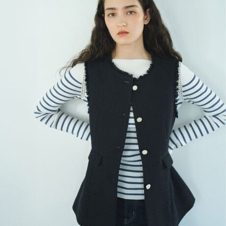 スカートにもパンツにも合わせやすい68cm丈のツイードジレ。ハイウエスト位置の切り替えと、飾りフラップがアクセントになり、さらっと羽織ってもスタイルアップして見えます。襟ぐりと袖ぐりのフリンジ仕様もポイントになっています。