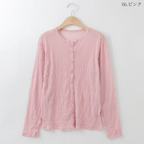 繊細な透け感とクシュクシュとしたシワ感が大人のニュアンスを加えるクルーネックカーディガン。