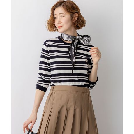 ボーダー柄が目を引くクルーネックのプルオーバーです。ピッチのバランスや配色にこだわったボーダーは、カジュアルになり過ぎず、大人のエレガントスタイルにも活躍します。手首がのぞく七分袖のデザインは、全体に抜け感を与えつつ、一枚着としてもバランスよく決まる絶妙な丈感。春先から真夏まで、ロングシーズン着回せる便利なアイテムです。同素材のカーディガンを肩掛けすれば、よりエレガントで洗練されたアンサンブルスタイルが完成します。ボトムスを選ばないシンプルなデザインで、オフィスでのきれいめスタイルから休日のカジュアルダウンまで、幅広いシーンで活躍します。