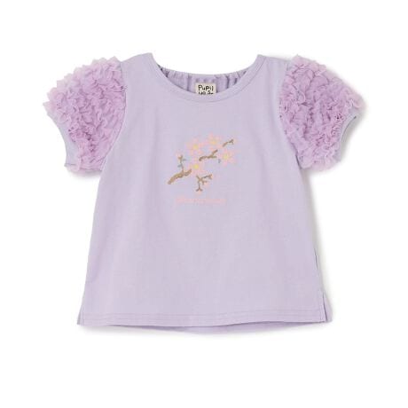 サクラのプリントデザインで季節を感じられるTシャツです。袖にはたっぷりのフリルをのせてボリューム感をアップ。本体はコットン100%素材でやさしい肌あたりなので、デイリーの着こなしに気兼ねなく着用していただけます。スカートともパンツとも合わせやすく、カジュアルさがありながらも女の子らしく決まるアイテムです。