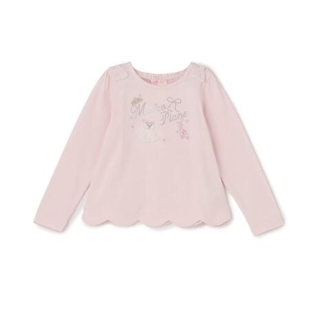 バレエモチーフが可愛く映えるTシャツです。キラキラのラインストーンロゴに、トゥシューズやチュチュ、ティアラなどの刺しゅうをあしらいました。肩のチュール&レースのリボンはスカート(品番:6061107)とお揃いの生地を使用。裾のスカラップで動きがあり、アウトスタイルをワンランク上に見せられます。内側にお名前を記入できるタグつき。