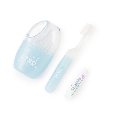 学校や修学旅行にぴったりのハブラシセットです。キャップの部分はコップとして使えるので、手が濡れてしまう心配がありません。コンパクトなサイズで持ち運びやすく、歯磨き粉もセットなのがうれしいところ。ラメのキラキラがポイントになっており、見た目も可愛いアイテムです。ロゴにはコームセット(品番:7761517)とお揃いのデザインをあしらいました。