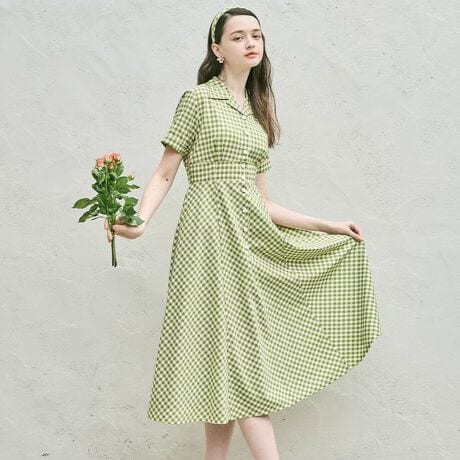 とびきりレトロなカラーリングのギンガムチェックが目を惹くワンピース。