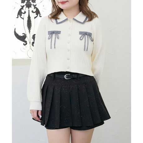 襟付きのデザインと配色が目を惹く、クラシカルムード漂うニットトップス。