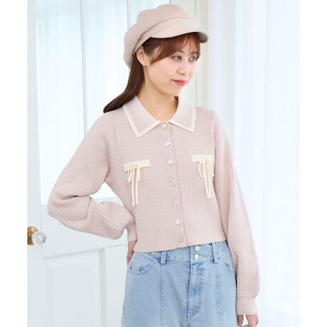 ミニケーブルの編地と襟元の配色デザインがアクセントに。
