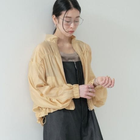 スタンドカラーとジップアップ仕様がアクティブな印象を与えつつ、シャーリングデザインがモードな遊び心をプラス。