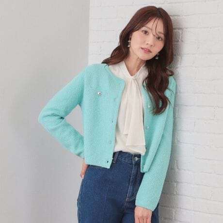 ・コットンラメのきらめきがさりげなく映える、ボクシーシルエットのショートカーディガン。